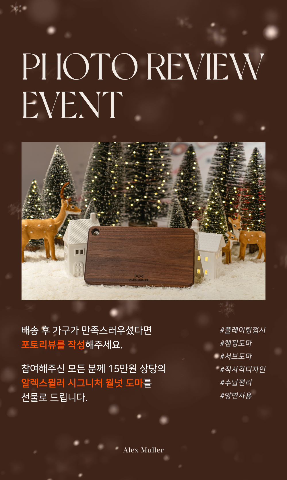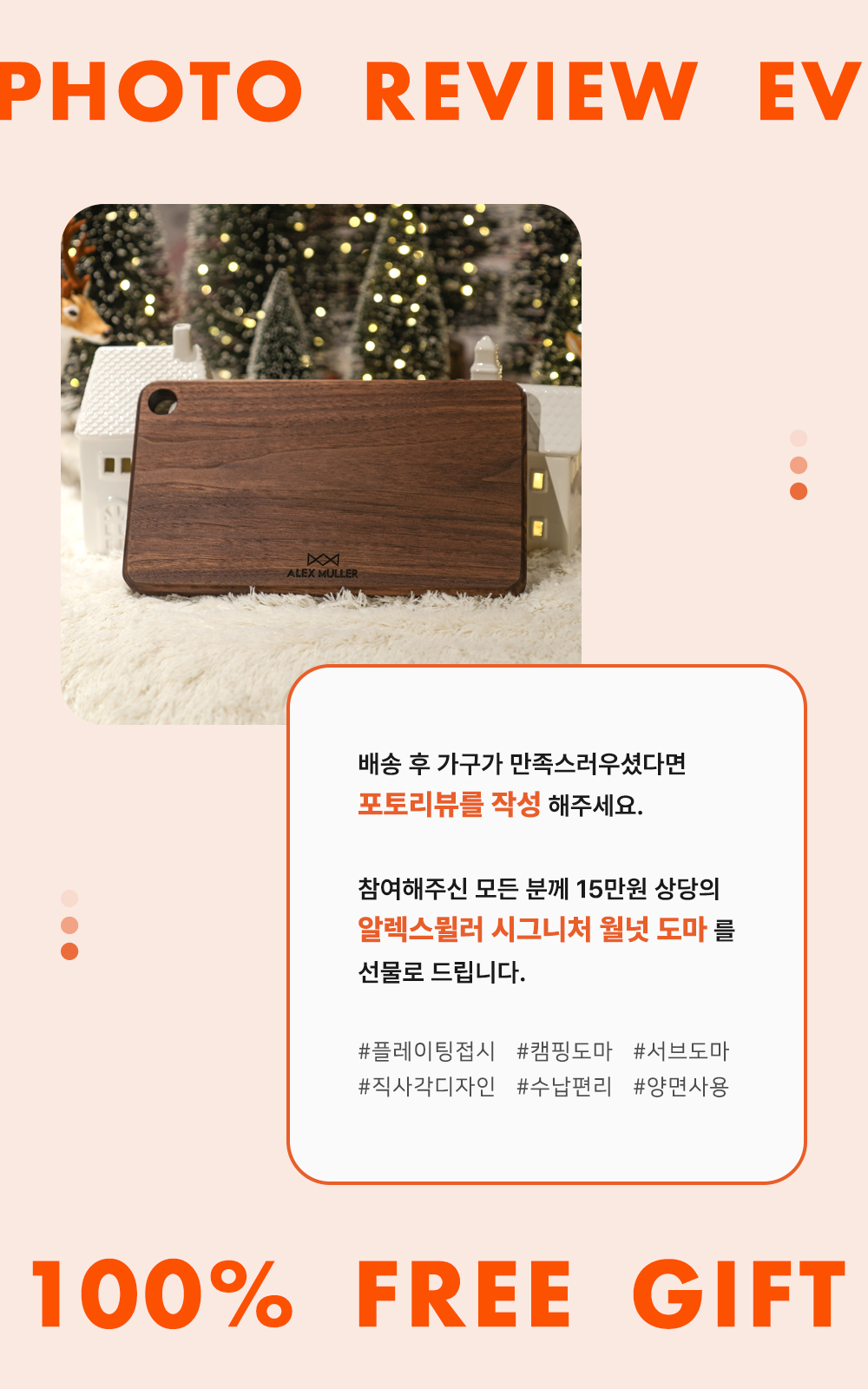 주드테이블 (권효* 고객님)오랜 로망을 실현시켜준 알렉스 뮐러, 한 달째 사용하고 있는 지금, 저의 오랜 로망대로 식탁은 우리집에서 가장 아름다운 공간이 되었습니다. 솔직히 매일 매일이 감동이에요. (식탁에 환장한 사람임...ㅋㅋ) 취향대로 다양한 상판과 사이즈를 커스텀 해주면서 이 가격에 판매하는 곳이 흔하지 않습니다. 한정된 예산으로 오랜시간 식탁에 집착해왔기 때문에 자신있게 말할 수 있어요!! 결국엔 알렉스 뮐러를 만나게 되어서 정말 다행입니다. 과하다 싶을 정도 크기의 식탁을 애써 배송해주신 담당 팀장님께도 감사드립니다. 이사날과 겹쳐서 일정에 문제가 있었는데, 끝까지 기다려 주시고 오히려 저희를 배려해주셔서 죄송하고 감사했습니다. 팀장님의 진지한 설명을 들으면서 알렉스 뮐러의 퀄리티와 꼼꼼함에 또 한번 확신이 들었습니다. 앞으로 오랜 시간동안 우리집을 빛내줄 주드 테이블! 사진에 그 아름다움이 다 담기지 않아 아쉽네요. 저처럼 길게 고민하지 마시길♥