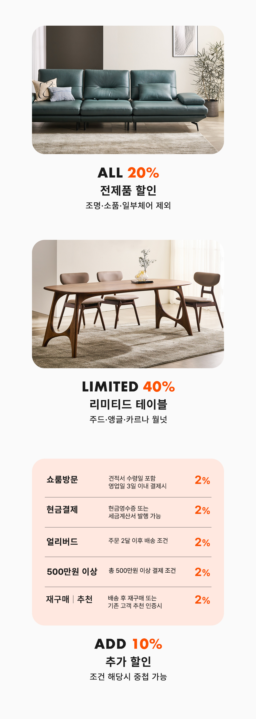 크레스트사 오스틴 가죽으로 된 소파를 사고 싶어서, 국내에 해당 가죽으로 만든 소파는 거의 다 보러 다녔어요. 가격이 맞으면 디자인이 아쉽고, 디자인이 마음에 들면 가격이 너무 비싸고 몇달을 결정하지 못하던 차에 알렉스뮐러 신제품으로 나온 고타 소파를 보게 되었습니다 알렉스뮐러는 친정에서도 몇년전부터 식탁으로 들여서 쓰고 계신 브랜드라 제게도 친숙했는데, 원목의 고급스러움이나 디자인이 정말 돋보이더라구요. 고타 소파는 알렉스뮐러 원목 특유의 견고함과 고급스러움이 잘 묻어나고, 좌방석의 적당한 깊이감과 목을 받쳐주는 구조가 앉았을때 정말 편안해요! 저희집 집들이에 온 손님들마다 앉아보고 너무 편하고 고급스럽다고 놀라고, 가격 듣고 한번 더 놀라네요. 안사면 손해라고 느껴지는 소파입니다. 개인적인 바람은 고타 소파와 세트로 놓을 수 있는 1인 체어나 스툴도 만들어주시면 좋겠어요ㅎㅎ