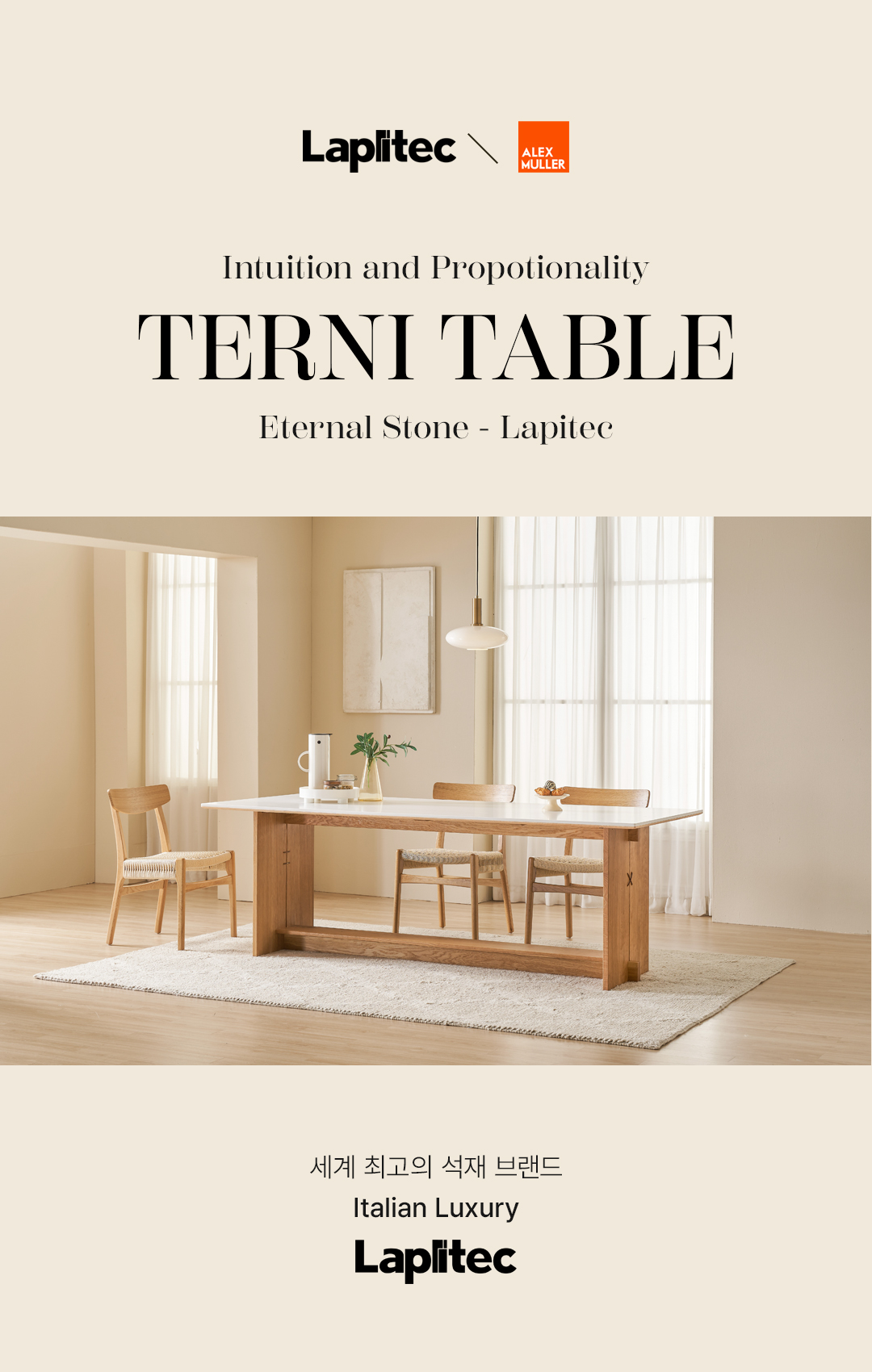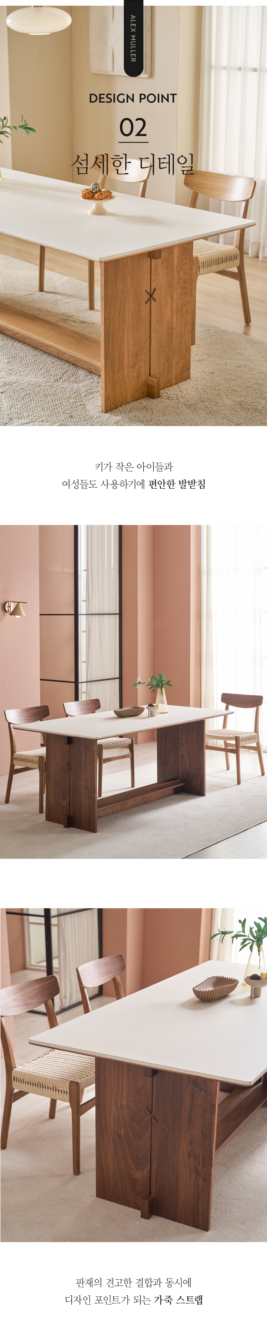 알렉스뮐러의 다이닝테이블 중 가장 직선적이고 남성적인 디자인으로 손꼽힙니다. 한옥의 조립 방식에서 고안하여 견고하고, 튀틀림 없이 무게를 받쳐주는 구조로 테이블 상판 지지를 하고 있으며 테이블 측면의 X 가죽 스트랩은 판재의 견고한 결합과 동시에 가구디자인의 포인트가 됩니다.