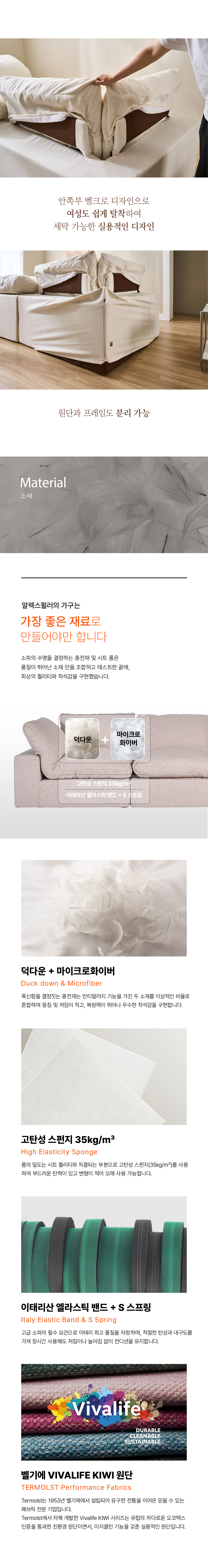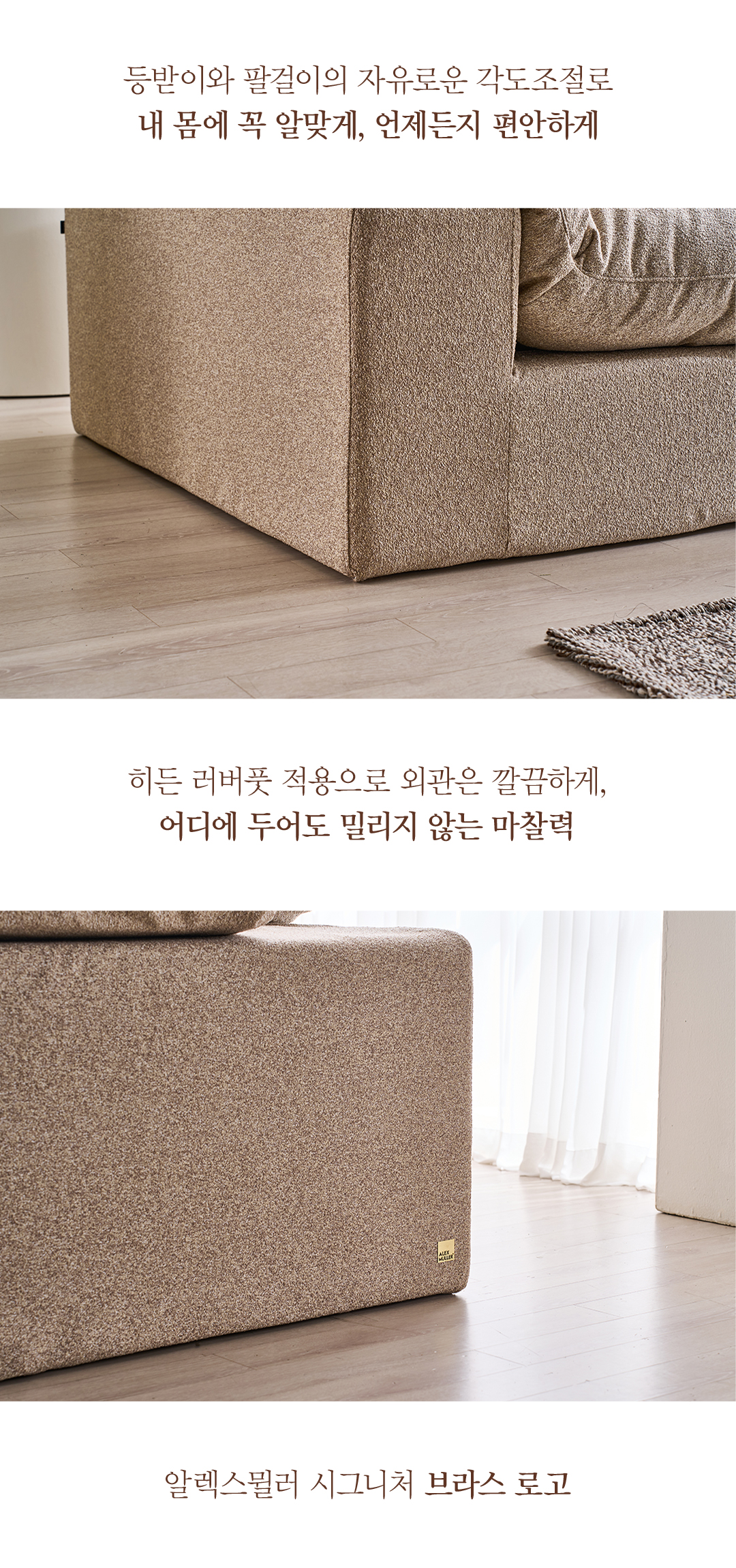 최대한의 장식을 배제하고, 본질만을 남긴 알렉스뮐러 미니멀리즘 소파 디자인의 정수입니다. 잠깐의 순간이라도, 어떠한 생각도 들지 않을 만큼 편안하게 나를 끌어 안아주는 부드러운 착석감과 나에게 꼭 맞는 각도 조절, 자리 배치, 세탁이 모두 손쉽게 되는 기능에 온 초점을 맞춘, 사용하면 사용할수록 더욱 그 가치가 돋보이는 소파입니다.