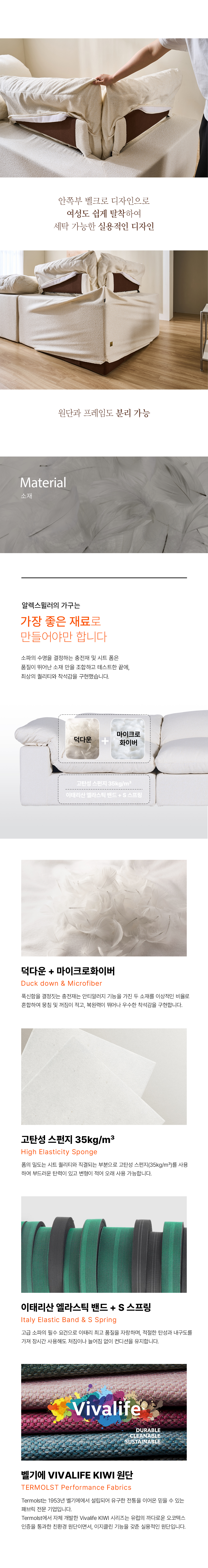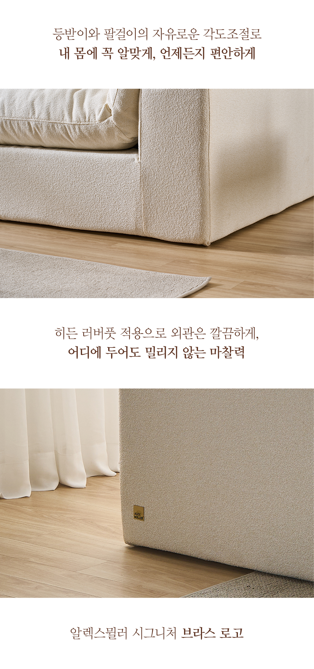 최대한의 장식을 배제하고, 본질만을 남긴 알렉스뮐러 미니멀리즘 소파 디자인의 정수입니다. 잠깐의 순간이라도, 어떠한 생각도 들지 않을 만큼 편안하게 나를 끌어 안아주는 부드러운 착석감과 나에게 꼭 맞는 각도 조절, 자리 배치, 세탁이 모두 손쉽게 되는 기능에 온 초점을 맞춘, 사용하면 사용할수록 더욱 그 가치가 돋보이는 소파입니다.